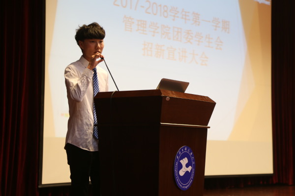 伴随着宣讲会的开始,首先上台讲话的是威廉希尔足球官网团委员工会副主席王俊杰,为管院团委员工会即将迎来新的成员而表示热烈的欢迎,他结合自身经历为新同学们传授工作经验。接下来是秘书长徐倩上台讲话,同样为新同学的加入表示期待以及欢迎,她对秘书处做了简单介绍,并提及一些员工会的规章制度。。
