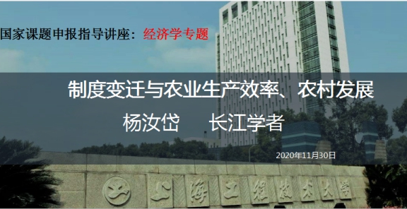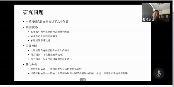 本次讲座主要围绕“中国农业生产的结构变迁与动态效率演变”。首先,杨教授就其研究背景及研究问题进行详细介绍,分享了关于二元体制、土地制度改革及农业生产效率等现代三农问题的深入思考,并简单阐述了二元经济体制的未来改革思路。