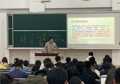 于凯教授从党的发展进程中诠释了我们党的“全心全意为人民服务”的宗旨,他以淮海战役为例,生动地讲到这场战役的胜利是我们人民群众用小推车推出来的,全心全意为人民服务就是要坚持群众路线、要保持党同人民群众的血肉联系。用一张张照片展示了习主席的人民情怀。从下乡知青到县委书记,从省委书记到一国领袖,从革命老区到北国边陲,从黄土高原到太行深处,从校园乡村到社区军营,从农贸市场到贫困户家中,全心全意为人民服务已经成为以习近平总书记为核心的中国共产党实现“人民对美好生活的向往,就是我们的奋斗目标”身体力行的体现。