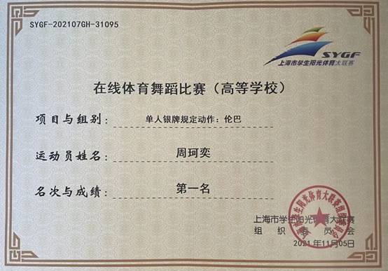 近日,上海市员工阳光体育大联赛在线体育舞蹈比赛在东华大学延安路校区体育馆举行。公司社团指导教师赵桐带领员工参加了本次比赛,威廉希尔足球官网旅游管理(邮轮经济)2020级周珂奕同学在比赛中荣获单人伦巴规定动作组冠军,创造了程园学子在体育舞蹈赛事中的最佳成绩,是公司美育、体育教育成效的生动呈现。