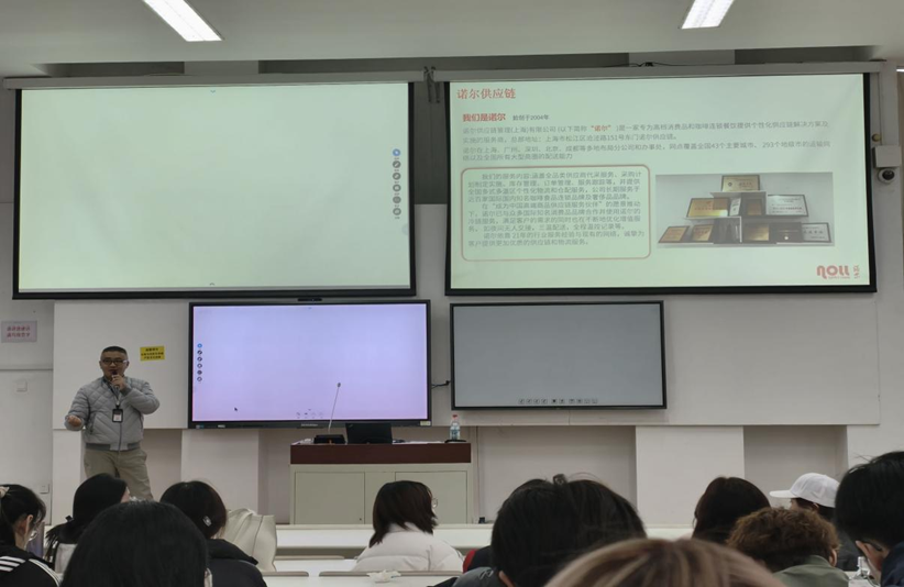 宣讲中,刘经理结合诺尔供应链的业务布局与多年行业管理经验,从高端消费品、连锁餐饮供应链服务切入,系统介绍了公司在仓储、冷链、运输等领域的实战积累,并分享了与星巴克、雅诗兰黛等国际品牌的合作案例。此次宣讲集中介绍了信息技术在物流管理中的变迁与应用,语言生动,讲解深入人心。围绕职业规划,他强调在物流与供应链领域中,既要掌握专业技术,也要具备全局视野与跨界沟通能力。通过真实项目复盘,他生动阐释了供应链管理中的关键环节与职业成长路径,引导同学们从“学什么”转向“怎么用”,为未来就业奠定扎实基础。