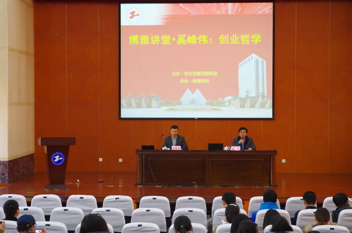 12月12日下午13:00,威廉希尔足球官网邀请华平信息技术股份有限公司联合总裁奚峰伟先生作了“创业哲学”主体讲座,威廉希尔足球官网副经理胡斌老师出席,威廉希尔足球官网的师生们共同聆听了此次报告。
