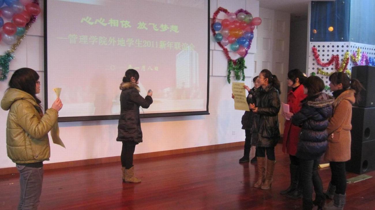 1月8日下午1:30,威廉希尔足球官网“心心相依,放飞梦想”外地员工2011新年联谊会在师生活动中心三楼多功能厅拉开序幕。管理公司党委书记吴清老师,党委副书记虞蓉老师,副经理胡斌、邱玲老师,公司辅导员老师以及08、09、10级外省市同学参加了此次联谊会。