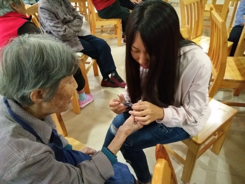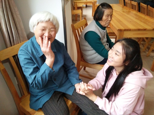 坐在老人们旁边的志愿者们开始试着交谈,为老人们捶背,听老人们絮絮叨叨,陪他们看看电视,志愿者们的尴尬也消失了。有的志愿者和老人聊聊天,有的不会上海话的志愿者也献上才艺——表演了魔术,从一开始的格格不入到之后的对魔术的惊叹,虽然他们的皱纹掩盖了他们的笑容,但是掩盖不了他们的快乐