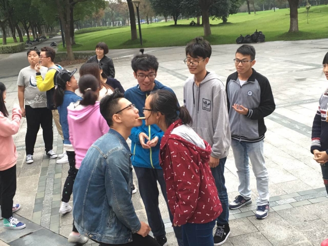 进行的第一个热身游戏名字叫“我爱你,不要脸”。大家按照规则男女穿插地围成一圈,依次对左边的同学说“不要脸”或对右边的同学说“我爱你”。当一位男生打破常规对右边的同性说“我爱你”时,活动刚开始大家无法放不开的沉闷气氛一下子被带动起来,所有人开始起哄,教学楼空旷的场地上盘旋着爽朗的笑声。随着气氛的转好,游戏“爱的抱抱”也圆满地进行了。而第三个游戏——袋鼠跳,则要求每组排成一列,第一人吹气球后用腰以下部分沿规定路线运送气球,接力往后传递,直至最后一人回到起点。其中有一组灵机一动,想到将气球绑在鞋带上,在第一轮获得胜利。第二轮中,游戏的难度升级,两个获胜组的组长必须用嘴叼住盛有水的杯子,夹住两个气球进行运送,杯中水剩多者胜。组员们站在一旁,努力地为本组的组长加油打气。随着时间的流逝,大家在主持人的引导下进入了“你演我猜”的游戏。为了激发同学们的想象力,素拓部修改了游戏的原来规则,将表达方式由动作改为唇语,结果也与以往截然不同:因为难度的升级,有两组没有猜出答案,并接受了抹面粉的惩罚。雪白的面粉在空气中漂浮,同学们脸上洋溢着的笑容是面粉无法遮盖的。在最后一个游戏也圆满结束后,本次“周末万花筒”圆满地划上了句号,同学们仍然有些意犹未尽,嬉笑打闹着离开了游戏现场并纷纷表示如果有机会,下次一定要再来。