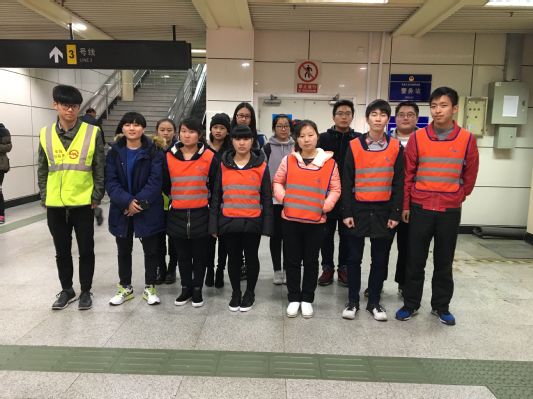 经过了漫漫车程,大约14点15分,志愿者们终于抵达目的地——上海南站,在这里他们将进行本次活动。志愿者们戴上了帽子并穿上了衣服,一个个都精神抖擞。随后在领队的分配下各自站到了自己的工作岗位上,开始为乘客们服务:在行李安检处的志愿者提醒带行李的乘客进行安全检查并帮助行李多的人搬行李,由于正好是周五,人比较多,志愿者们还得兼顾疏散人群,指导人们有序的排队进行检票。他们勤奋的工作与优异的表现得到了地铁工作人员的赞许;在售票窗口的志愿者细心指导人们买票,遇到老年人看不清屏幕上的字,他们甚至会问清楚后替他们买好票,没有半点不耐烦之意,遇到说外地方言的外地人,他们也会尽心尽力地去指导,从未有放弃的念头;在2号口工作的志愿者们为行人礼貌地指路,若恰巧碰到路人说出的地方自己也不清楚,也会马上看地图给出正确的路线,不会胡乱指路,对于行人所提出的一些问题也会尽力回答从不马虎;在闸机口的志愿者则热情的帮助乘客安全的度过闸机,一些乘客因为刷不了卡很着急,志愿者就仔细地指导他们如何正确地刷卡,实在不行,也会指出服务台的方向让他们去那里咨询,在人少的时候志愿者就看看地图和留心指示牌以便于之后能够及时答复乘客的问题。每名志愿者都尽全力做到尽心尽责,为他们提供有益的帮助。