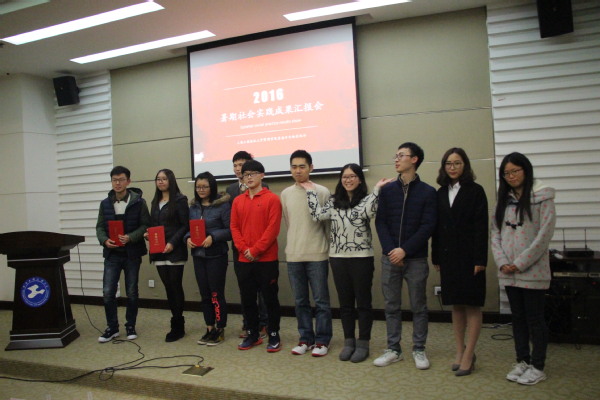 大会进行到颁奖环节。首先颁发的是最佳人气奖,获得2016年暑期社会实践活动最佳人气奖的项目是“老海滨,新港湾”爱心暑托班,分别获得了本次暑期社会实践活动的一二三等奖的是“基于创新服务四维度模型对社区基金会支持养老服务供给模式”、“走进藏区,关注民生”、“云南省西双版纳州勐海县帕真新寨哈尼族生存现状、文化变迁及经济发展状况研究调查”项目。校团委实践部副部长钟璐蔓、郭志顺、秘书处常务秘书傅宸璨依次对获奖团队进行颁奖。台下传来的阵阵掌声是对这些优秀项目的肯定,更是对明年暑期社会实践的期许。