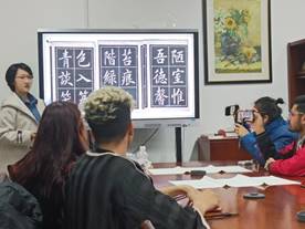 A piece of paper, a pen , an inkstone and an ink-stick bear the writing culture of China for five thousand years, and set up a bridge across the mountains and oceans, so that Chinese and foreign students can enjoy the fun of calligraphy, increase friendship and exchanges, promote cultural integration, and carry forward and spread traditional Chinese culture under the premise of respecting the cultural differences of different countries and regions.